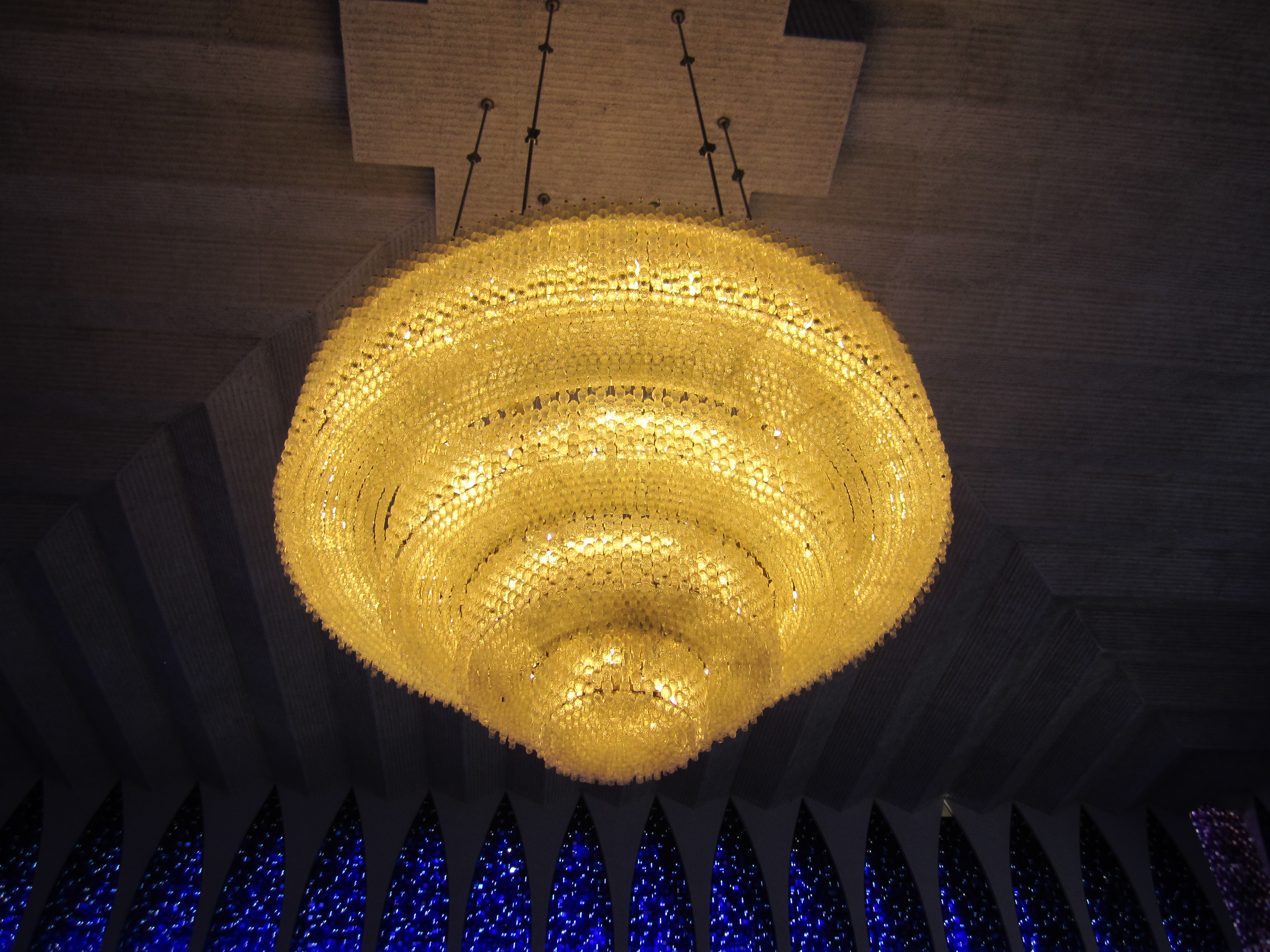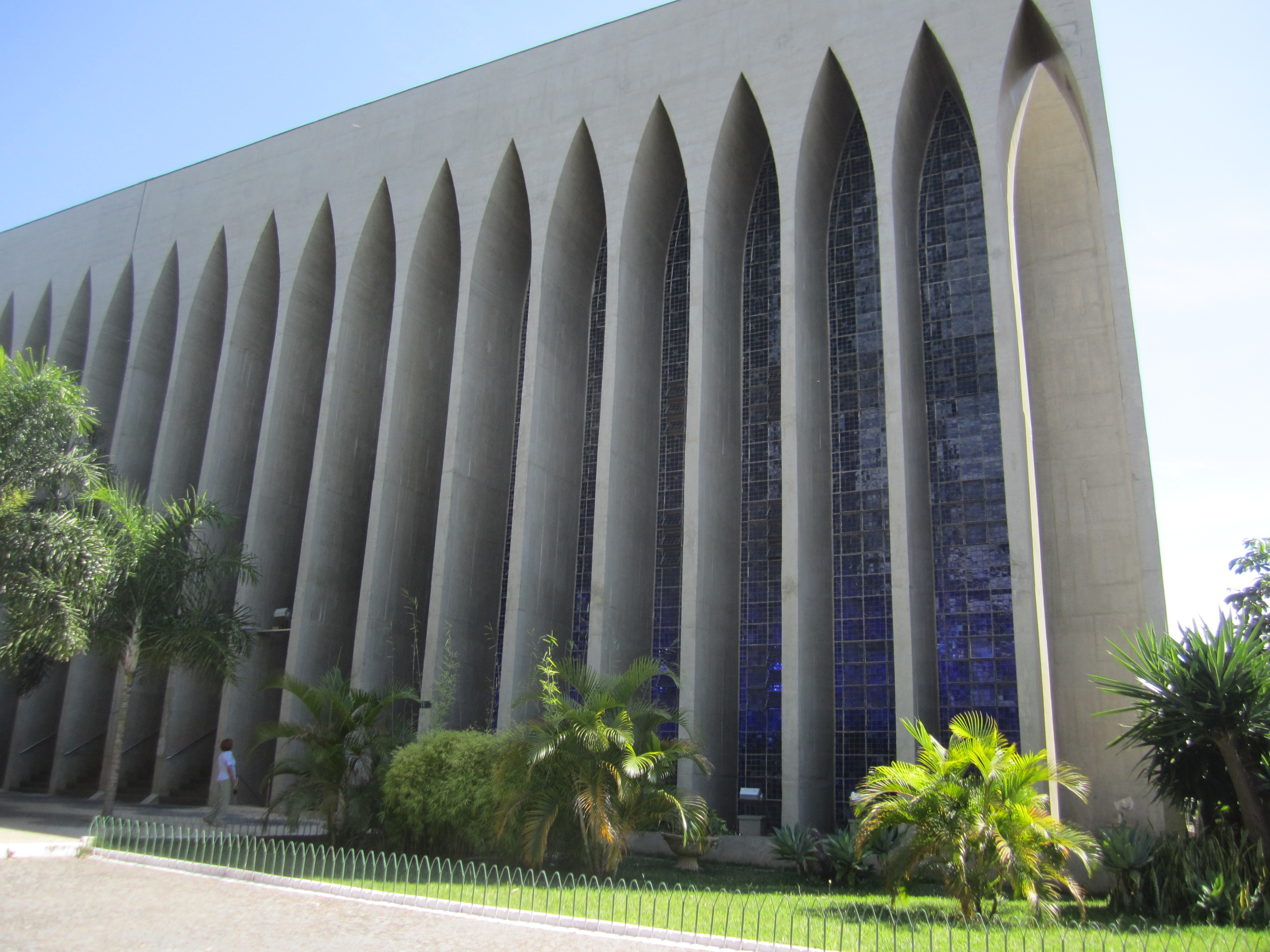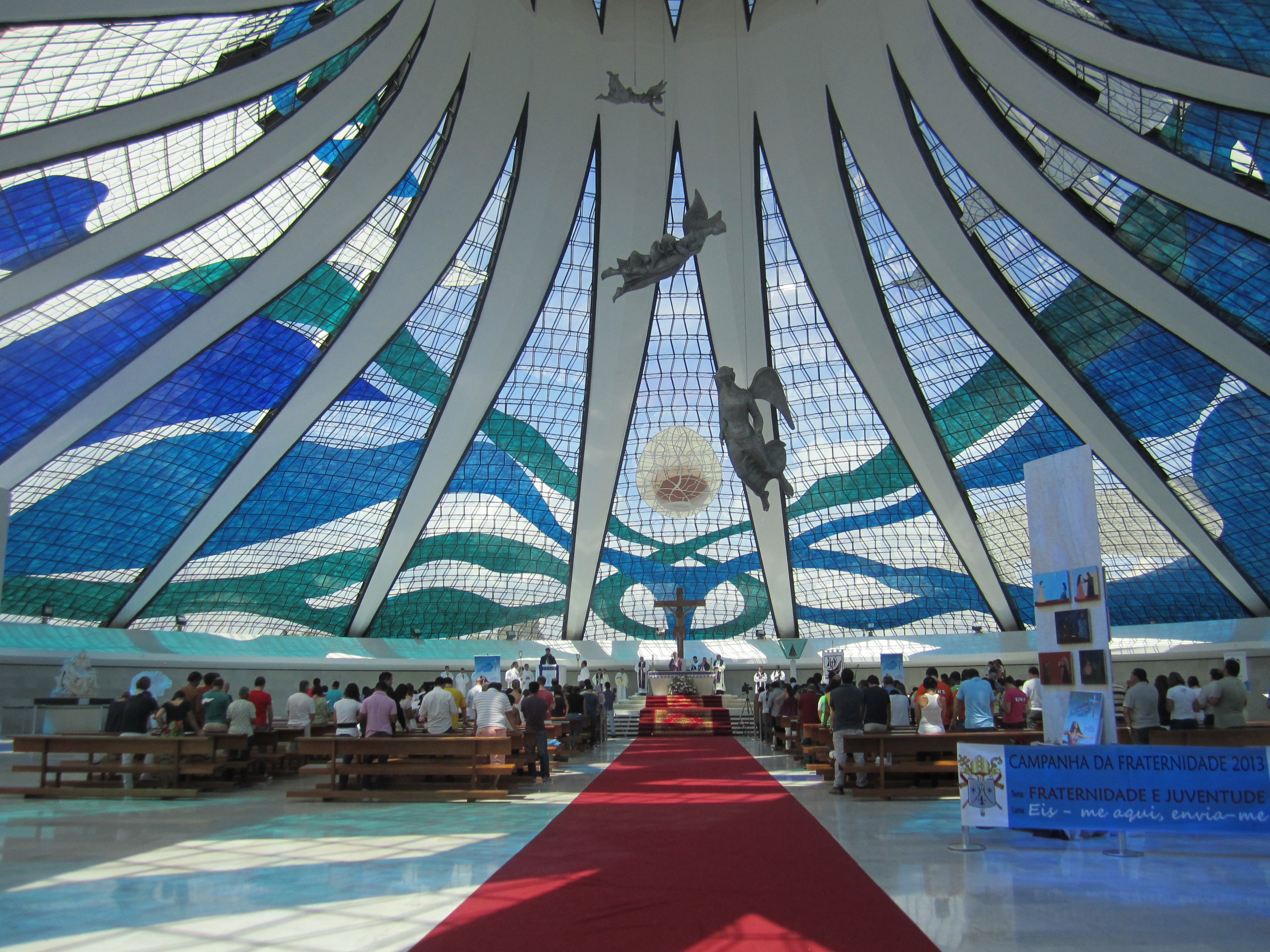 În 1883, the Italian saint Dom Bosco made, it seems, a dream about a Utopian city of the future, located in the New World, which would be located between the 15 th and 20 th south parallels. This city would become the capital of a country, the government of which would administer the country with great justice and would meet all the needs of a great nation. It is partly this vision that would have inspired and influenced the foundation of Brasilia. So we built this original church to honor it; the exterior is simple but aesthetic by the effect of repetition of the windows framed by long vertical lines terminated by acute arcs. But the interior is even more beautiful with stained glass windows that play on all the tones of blue. The windows are composed of small squares of stained glass colored 12 shades of blue, with some white spots. They were designed by Hubert Van Doorne. At night, another illumination fills the church: it is that of the chandelier made of 7400 pieces of Murano glass, made by Alvimar Moreira. The church contains two life-size statues of Dom Bosco and Nossa Senhora Auxiliadora, a 10-ton altar made of Carrara marble and a large crucifix carved in a cedar by Gotfredo Tralli.