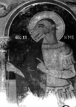 „s-a arătat în mijlocul poporului un uriaş înfricoşat, tânăr cu vârsta, iar cu chipul şi căutătura sălbatică, dinţii lui ies afară din gură ca şi ai porcului, capul lui este ca de câine şi, în scurt să zic, atât este de grozav, încât nu pot nicidecum să-i povestesc chipul lui. „