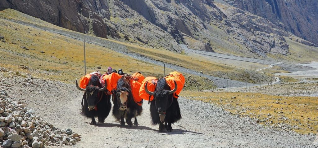 De la lac am plecat cu autobuzele spre locul de unde se mergea apoi pe jos spre munte. Inițial am ajuns la un hotel normal (adică cu caldură cât de cât în camere) apoi a doua zi am început pelerinajul la pas. Am mers pe jos aproximativ 12km până la munte. Aveai posibilitatea să plătești o mașină 4×4 ca să te ducă sau să plătești un șerpaș (sherpa) tibetan care să-ți poarte rucsacul și care să te acompanieze pe drum . Eu am ales a doua variantă, deși nu aveam un rucsac greu, se pare că orice kg în plus îmi încetinea ritmul cu mult mai mult decât aș fi putut crede inițial. Ultimii km i-am făcut foarte încet, cu multe pauze, timp în care tibetanii mă depășeau mergând normal. Ai o senzație de frustrare să vezi că nu poți să mergi pe teren aproape plat într-un ritm normal, ci trebuie să-ți asculți inima și respirația în primul rând, pentru a rămâne în viață. 😳